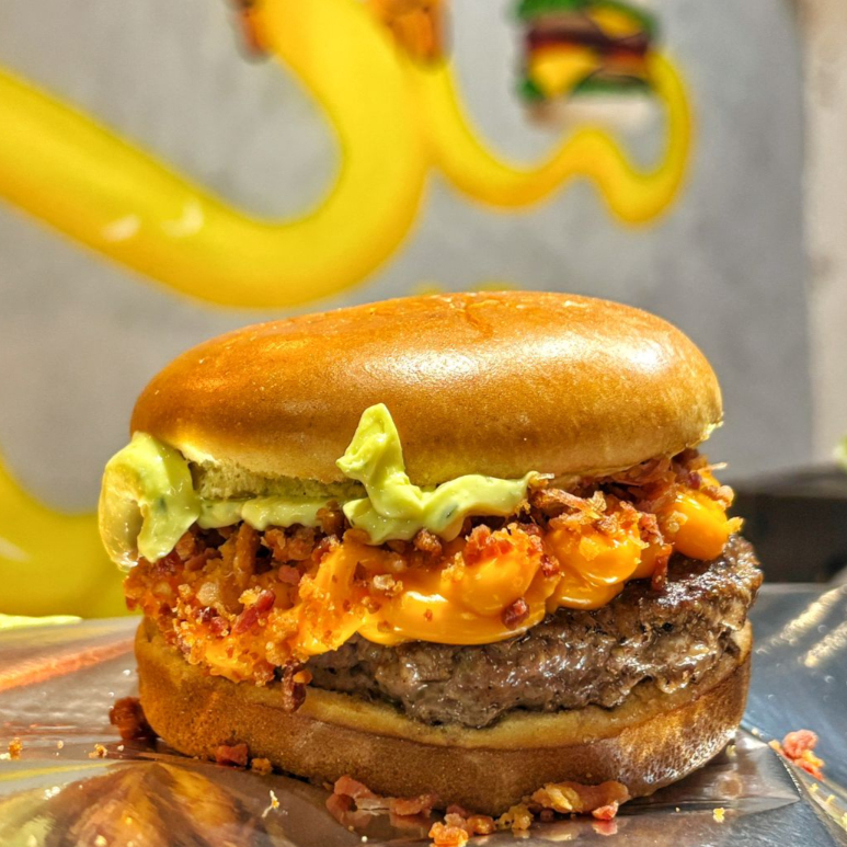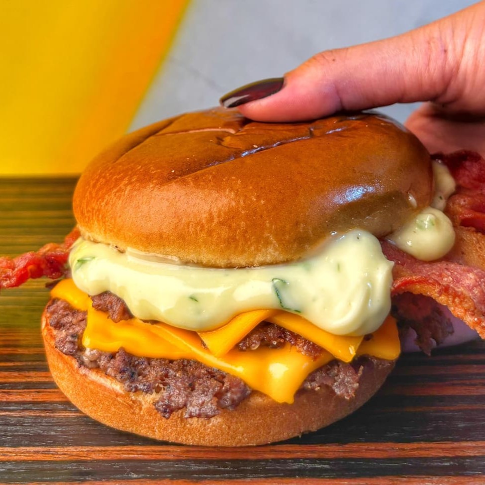 Duas carnes smash com queijo cheedar fatiado, bacon crocante e maionese dos Deuses no pão tipo brioche.