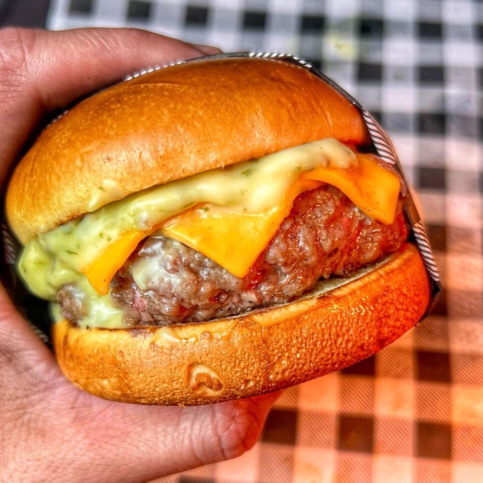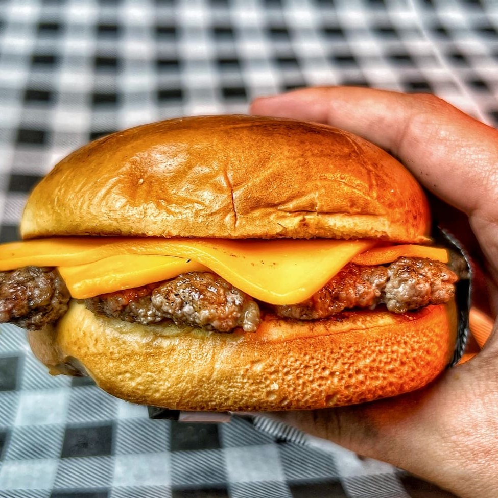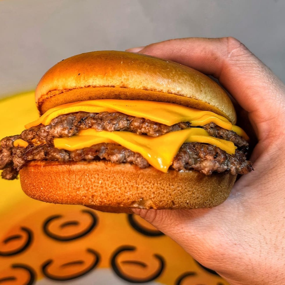 Duas carnes smash com crosta, queijo cheddar fatiado derretido e Pão tipo brioche.