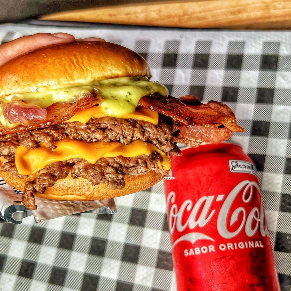 Smash São Pedro Duplo bacon: Pão brioche, 2x carne smash 70g, fatias de queijo cheddar, fatias de bacon e maionese dos deuses. Coca cola geladinha 350ml.