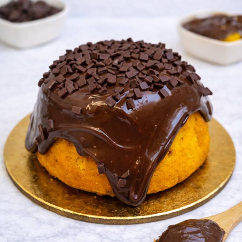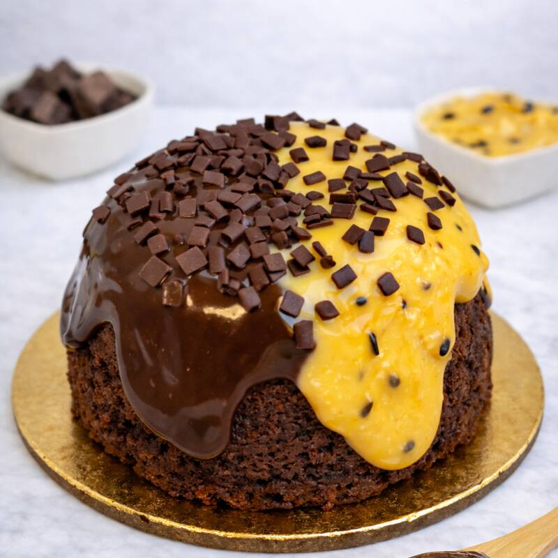 Bolo de chocolate super macio, coberto com uma generosa camada de brigadeiro de chocolate e finalizado com brigadeiro trufado de maracujá cremoso. Uma explosão de chocolate com o toque irresistível do maracujá.(aprox:300)