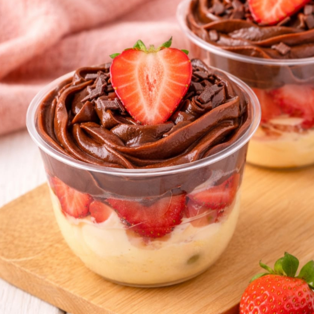 Camada de brigadeiro branco ultra cremoso, morangos frescos com brigadeiro chocolate, formando o clássico bombom de morango em versão de copo. (150ml)