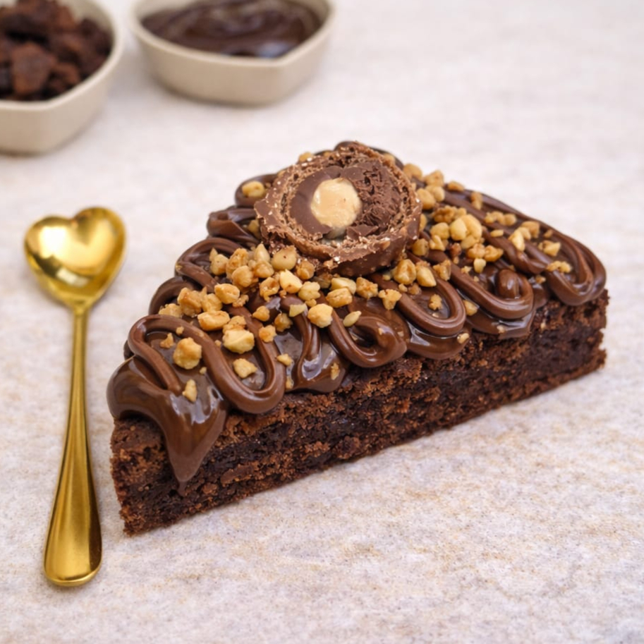 Massa de chocolate fofinha coberta com brigadeiro cremoso de chocolate blend, finalizada com creme de avelã, flocos de amendoim e metade de um bombom Ferrero Rocher. Um pedacinho de puro sabor!