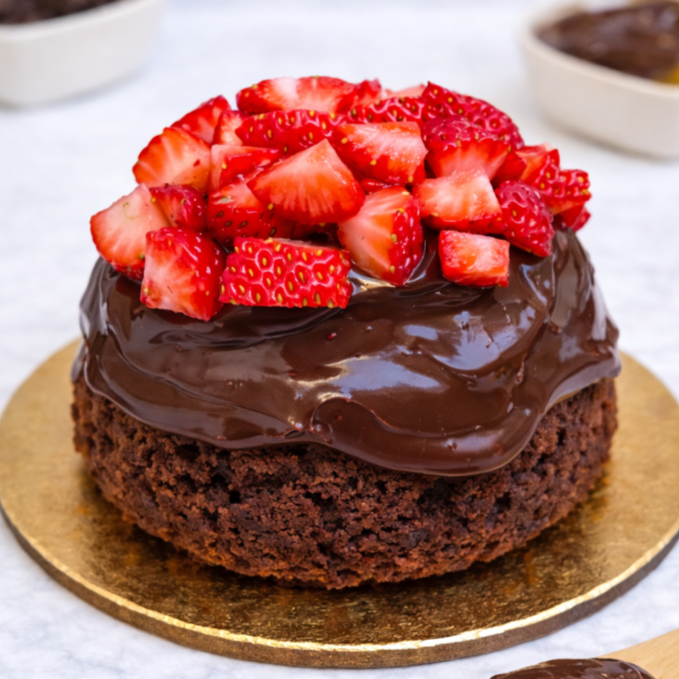 Bolo de chocolate macio coberto com brigadeiro cremoso de chocolate blend e finalizado com uma generosa porção de morangos frescos picados. Um clássico com um toque especial de frescor e sabor! (Aprox:250g)