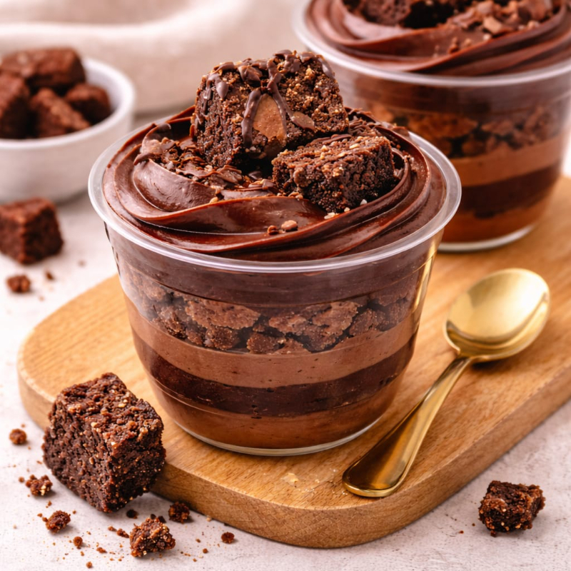 “Brigadeiro de chocolate ultra cremoso com pedaços generosos de brownie que derrete na boca.
