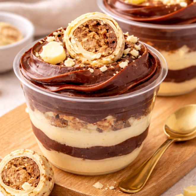 Camadas de brigadeiro de chocolate, brigadeiro branco cremoso e pedaços de brownie, finalizado com um mini ovo de chocolate. Uma sobremesa especial de Páscoa, super cremosa e irresistível.