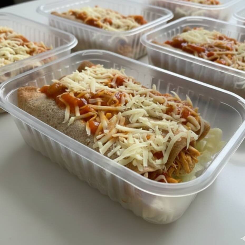 Deliciosas panquecas feitas com massa integral, recheadas com frango bem temperado, cobertas com molho de tomate caseiro e finalizadas com queijo, proporcionando uma refeição prática, nutritiva e saborosa. Ideal para quem busca uma alimentação equilibrada e funcional. Peso líquido: 350g | Marmita congelada | Sem conservantes | 100% caseira