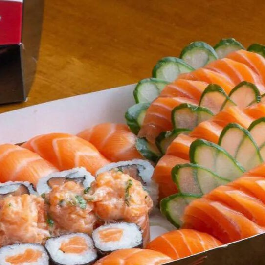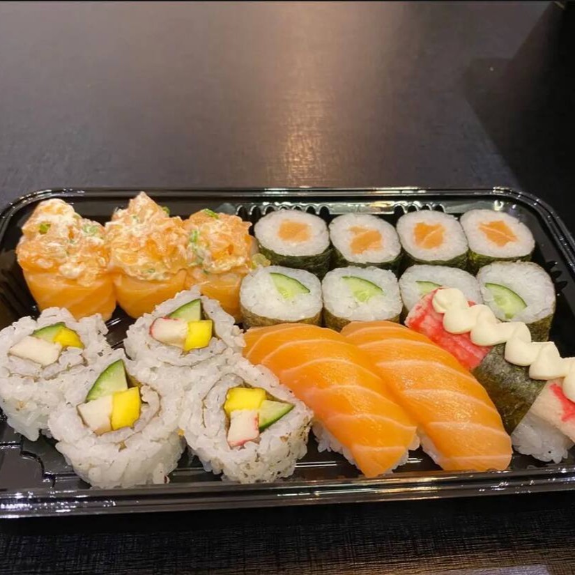 16 Sashimis, 8 Sushis, 4 Uramakis de Salmão com Batata, 4 Salmomakis e 4 Joe.