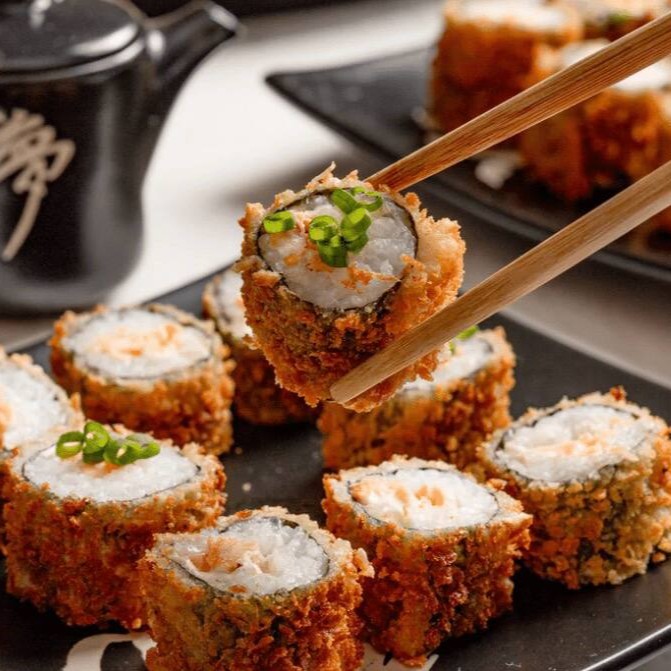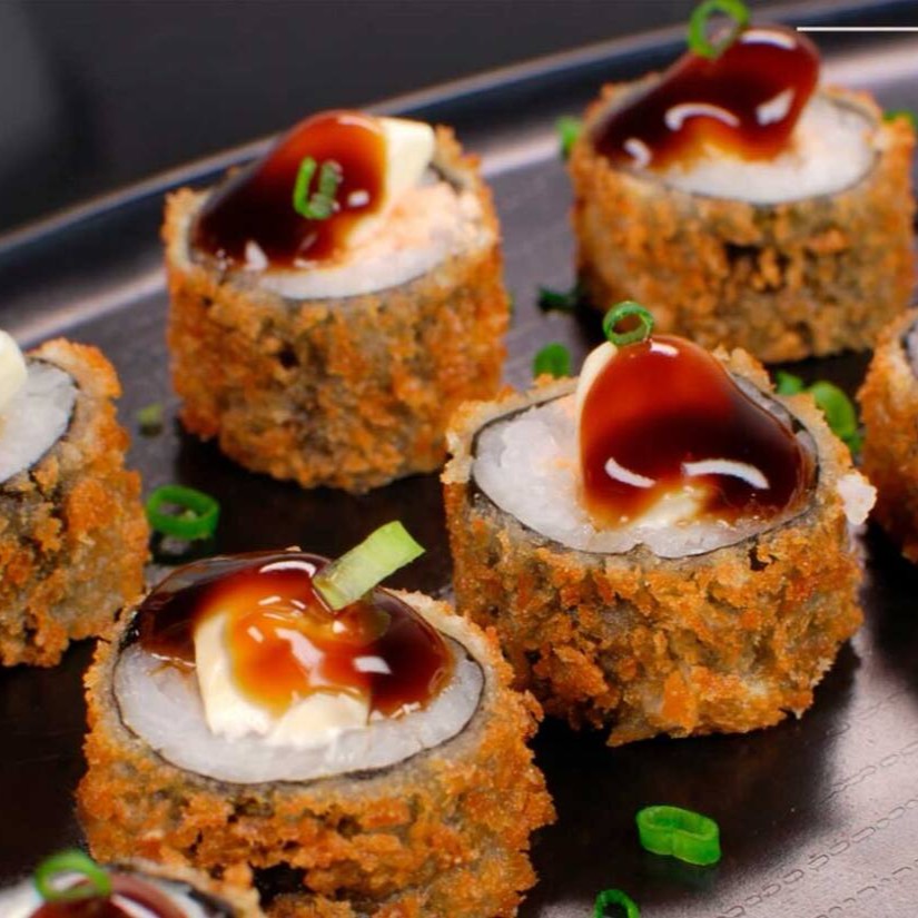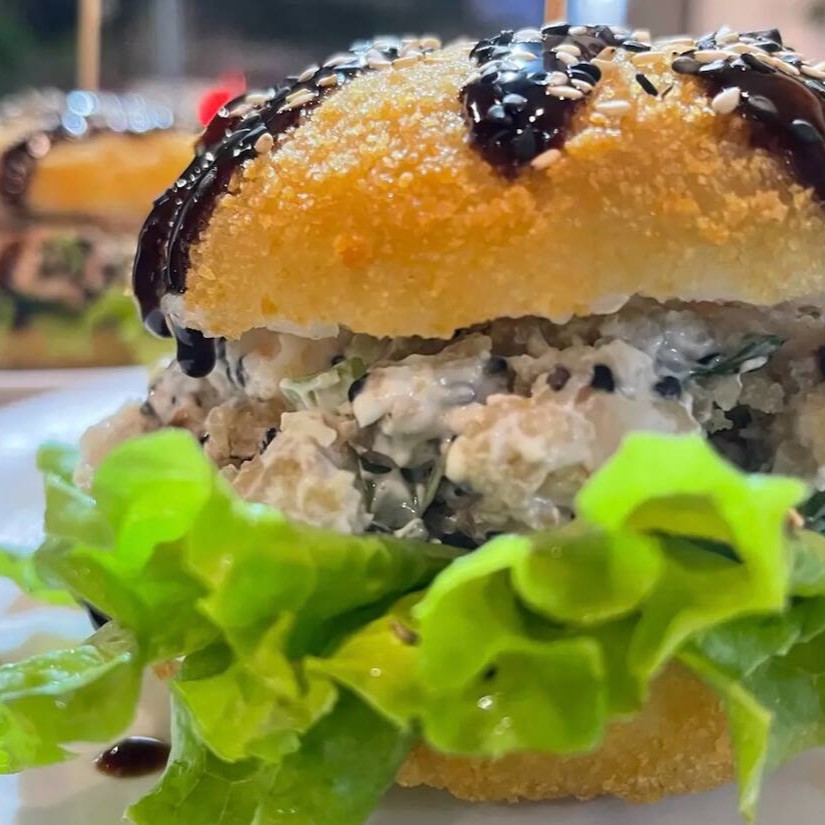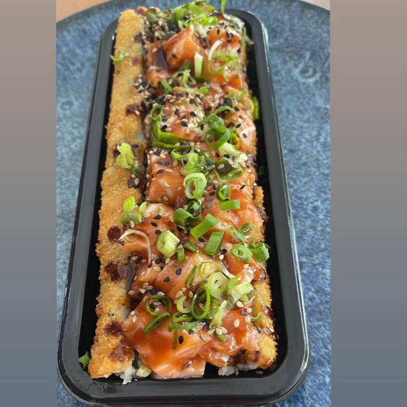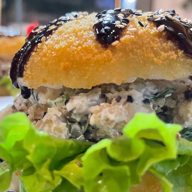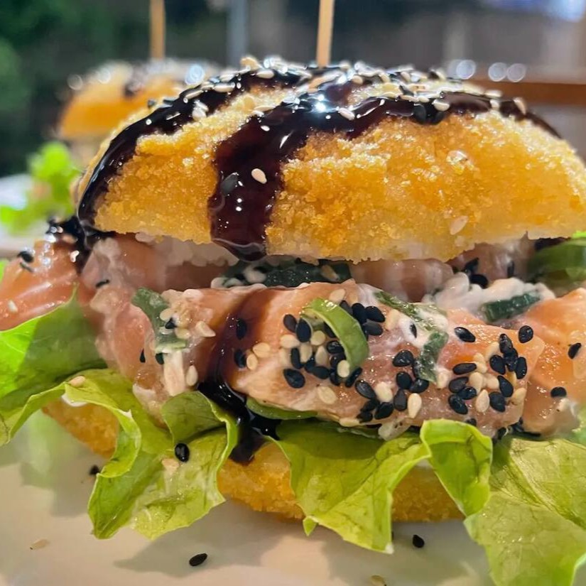 Delicioso “burger” de sushi com arroz, peixe fresco e sabores irresistíveis, crocante por fora e macio por dentro.