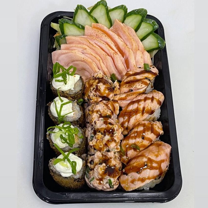 10 Sashimis de Salmão, 8 Niguiris de Salmão, 16 Salmomakis, 8 Hot de Salmão, 8 Uramakis de Salmão Grelhado com Batata + 1 Temaki