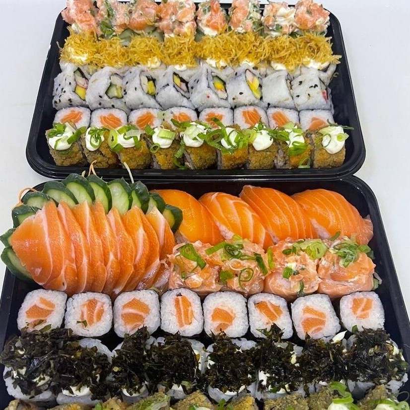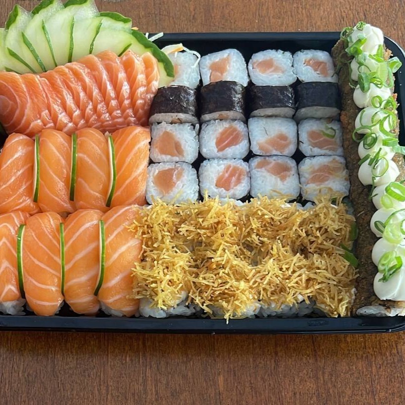 8 Uramakis de Salmão Grelhado com batata, 8 Salmomakis, 8 Hot Rolls, 8 Joe de Salmão e 8 Uramaki Califórnia.