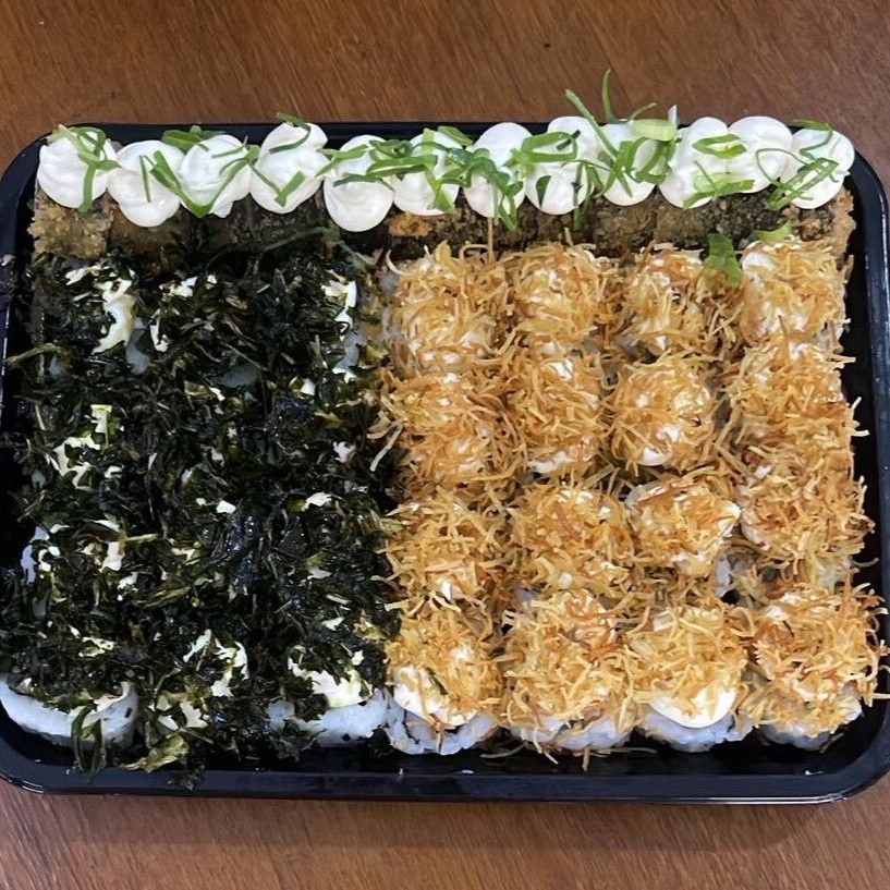 16 Uramakis de Salmão Grelhado com Crispy de batata doce, 12 Hot Roll de Salmão com Cream Cheese e Cebolinha, 12 Uramakis Skin com Couve.