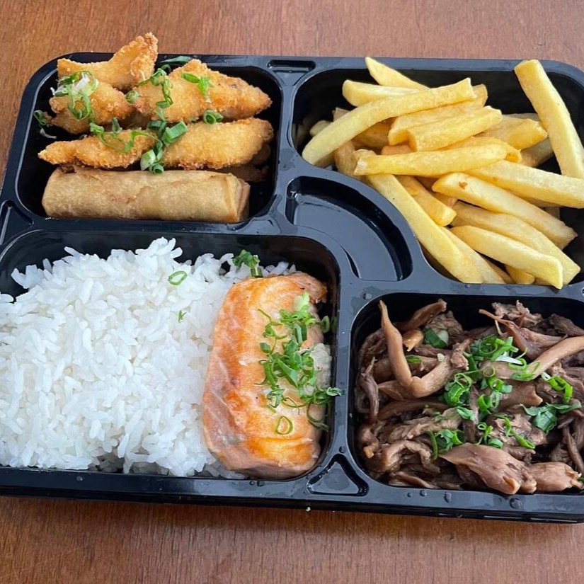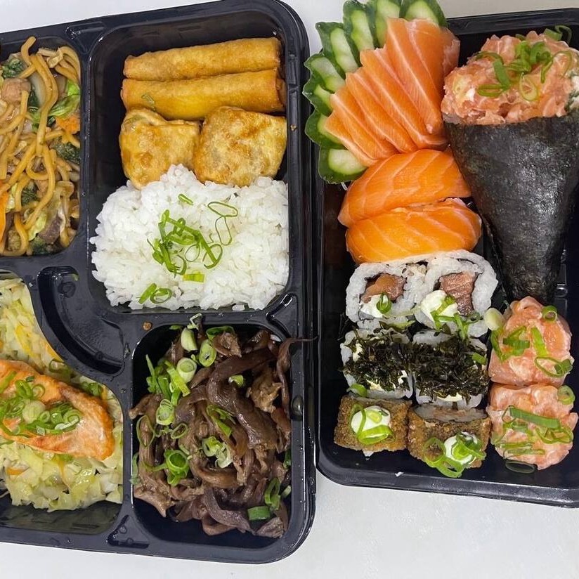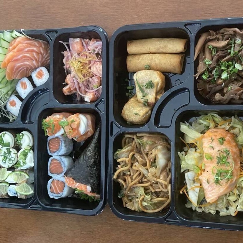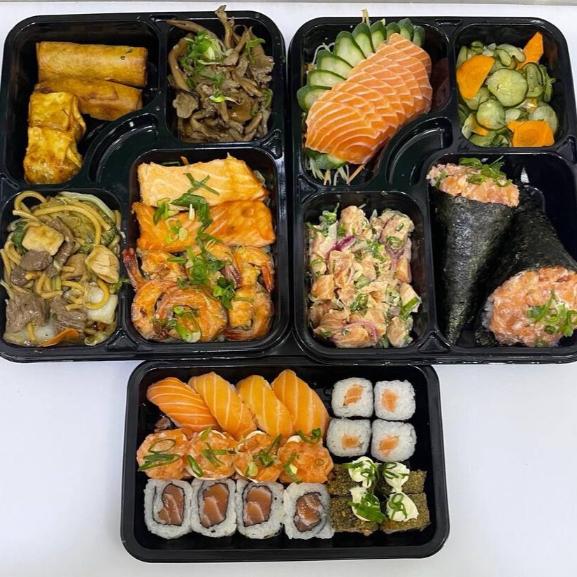 1 Salmão Grelhado (50g), 1 Yakissoba Clássico (100g), 2 Harumakis, 2 Guiozas, 1 Shimeji (50g), 1 Porção de Gohan (50g), 5 Sashimis de Salmão, 2 Joe de Salmão, 2 Hot com Couve Crispy, 2 Hot Salmão, 2 Niguiri de Salmão e 1 Temaki (100g)