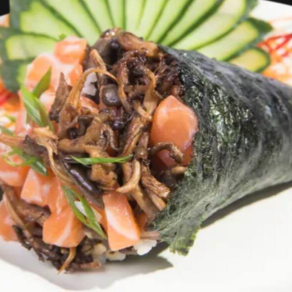 Delicioso “burger” de sushi com arroz, Salmão grelhado e sabores irresistíveis, crocante por fora e macio por dentro.
