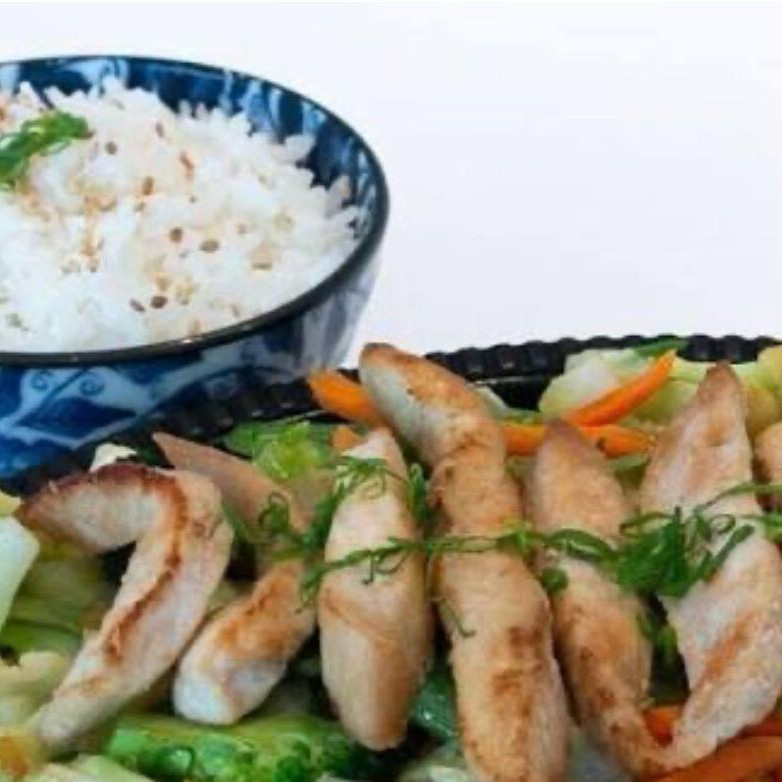Filé de frango grelhado com legumes, acompanha arroz e Shimeji.
