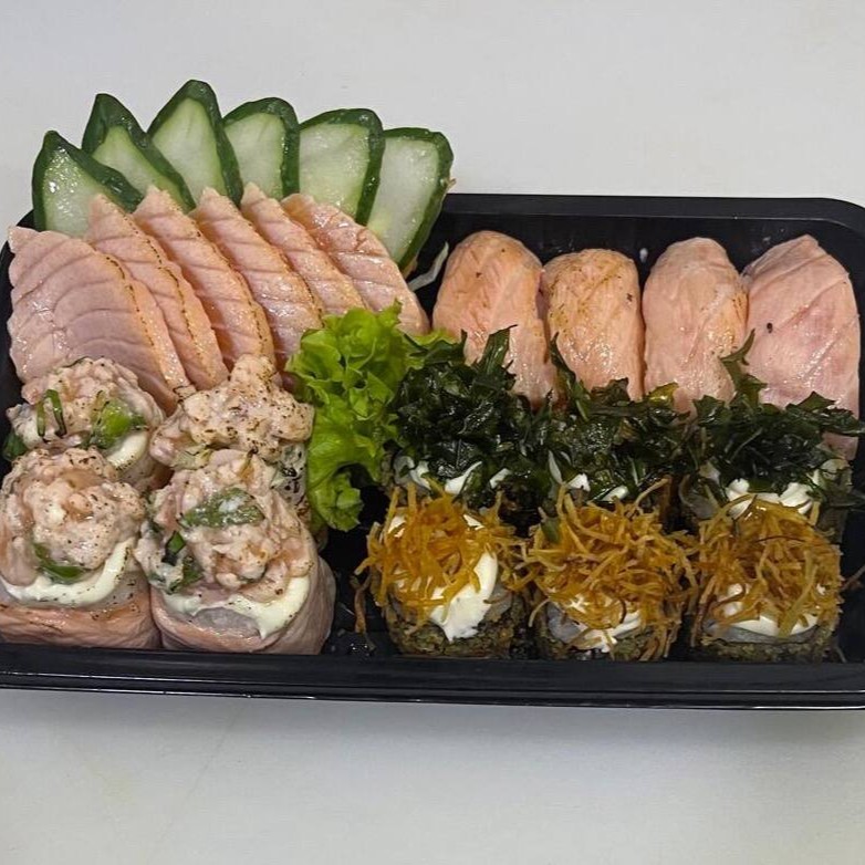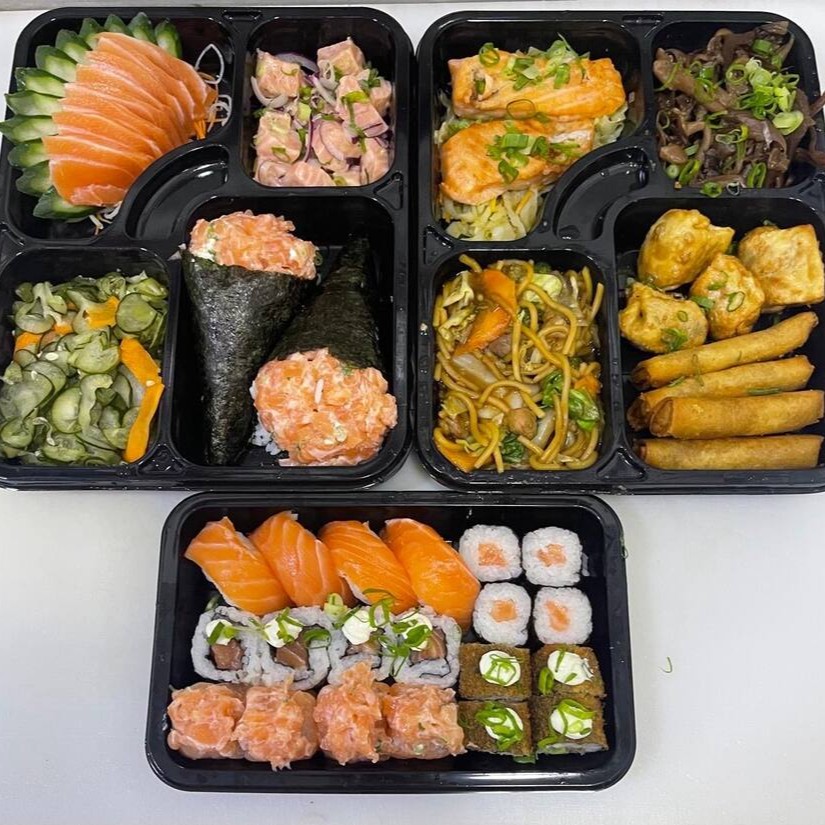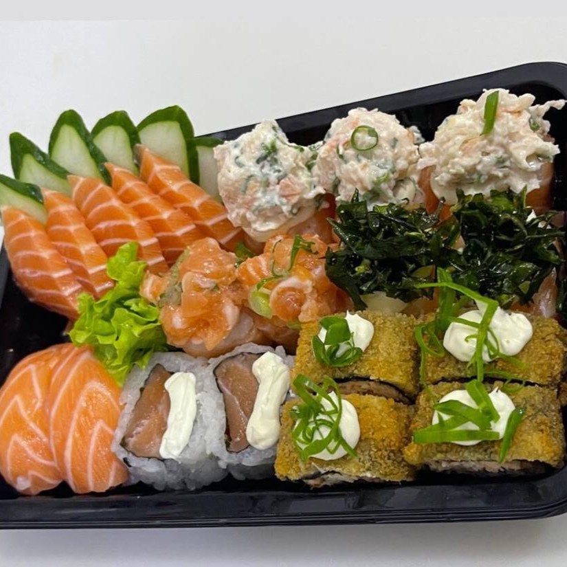 8 Sashimis de salmão, 4 Niguiris de Salmão, 4 Joe de Salmão, 8 Salmonmakis, 8 Hot de Salmão, 8 Uramkis Skin, 4 Harumakis, 4 Guiozas, 2 Salmão Grelhado (50g cada), 1 Yakissoba Clássico (150g) e 1 Shimeji (100g)