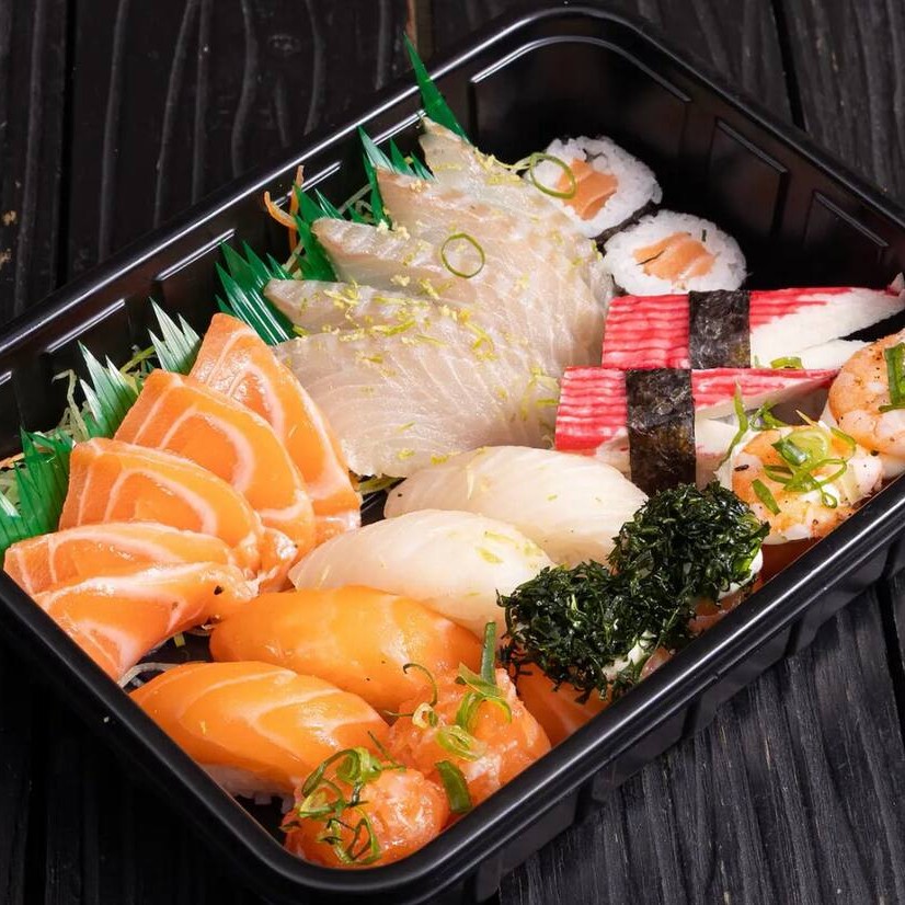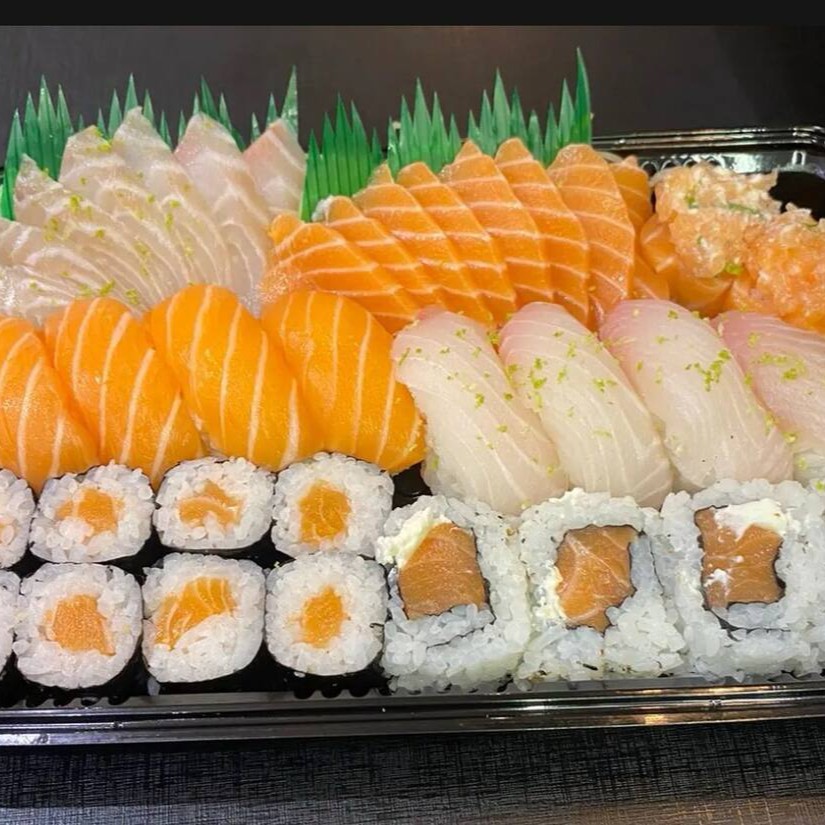 16 Sashimis (Salmão e Tilápia), 8 Niguiri (Salmão e Tilápia) , 8 Hossomaki de Salmão, 4 Uramaki de Salmão, 2 Joe de Salmão.