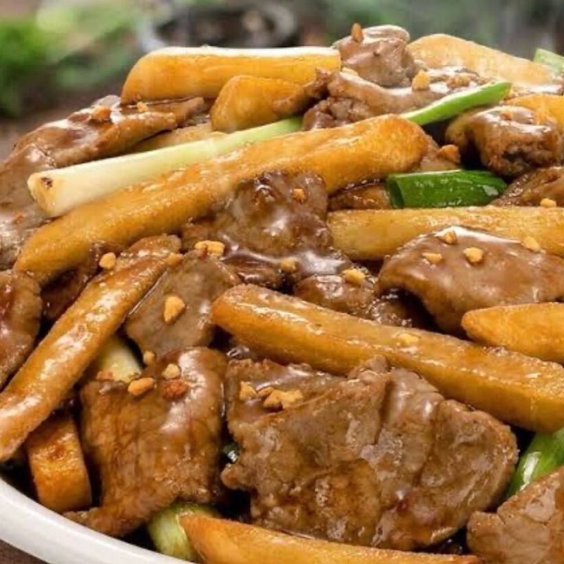 Carne bovina com batata palito e cebolinha ao molho da casa. (500ml)
