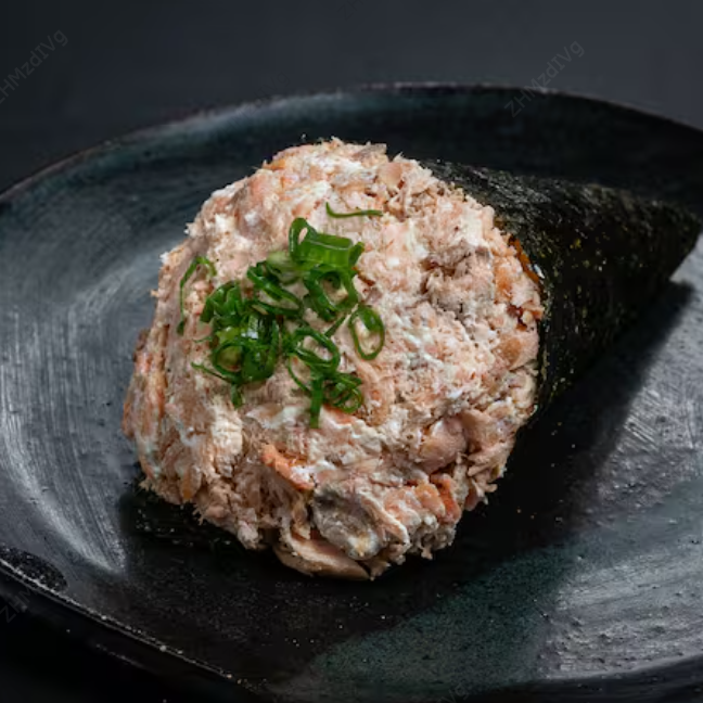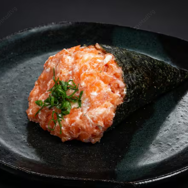 Cone de alga nori recheado de sushi e cubos de salmão fresco e macio.