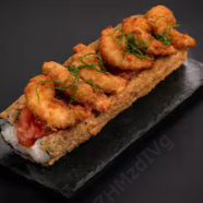 Recheado com camarões grandes, empanados e fritos, resultando em uma textura crocante e quente. Geralmente acompanha cream cheese ou molho para realçar o sabor.