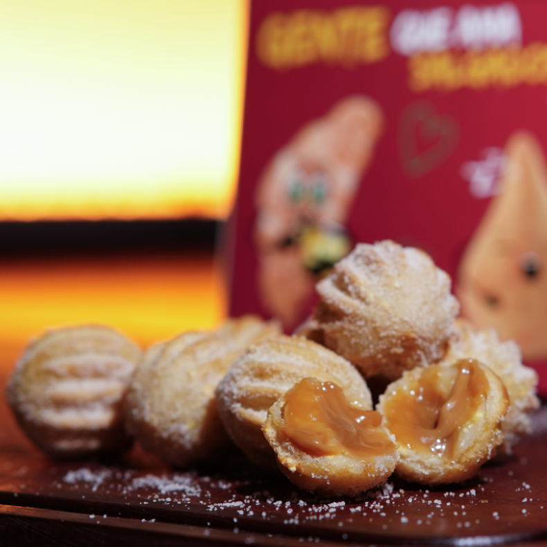 Mini Churros Recheados com Doce de Leite. Crocantinhos por fora, macios por dentro e recheados com doce de leite cremoso de alta qualidade. Perfeitos para acompanhar aquele café, matar a vontade de doce ou deixar qualquer momento ainda mais especial. Nossos mini churros são preparados com massa fresquinha, fritos na hora e chegam até você quentinhos, sequinhos e irresistíveis. Uma explosão de sabor que combina crocância, maciez e o recheio que derrete na boca.