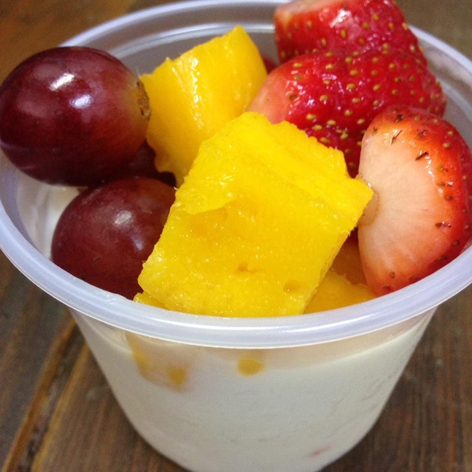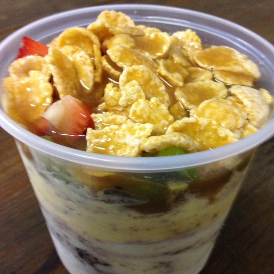 Salada de frutas com uma cobertura + 1 cereal grátis. Está tudo incluso no valor.