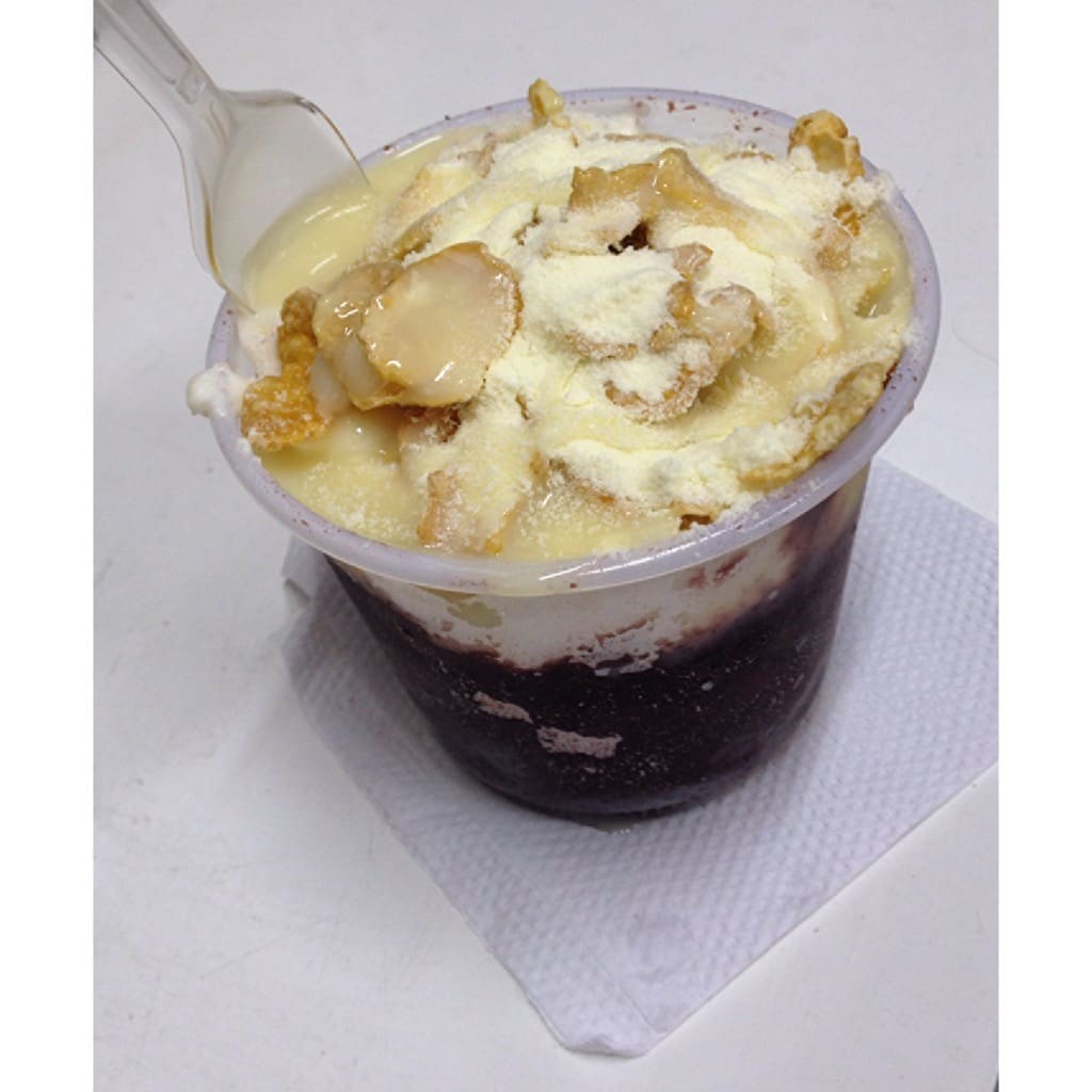 Açai, creme e acompanhamento. Você escolhe o creme e o acompanhamento de sua preferencia para colocar junto com o açai no pote P(250ml). Obs. Entrega grátis até taxa de R$9,99.