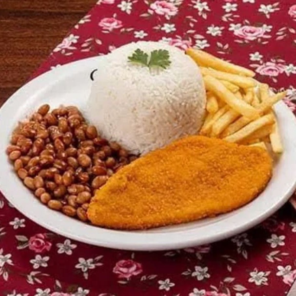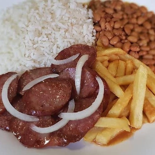 Arroz, feijão, Toscana acebolada com fritas