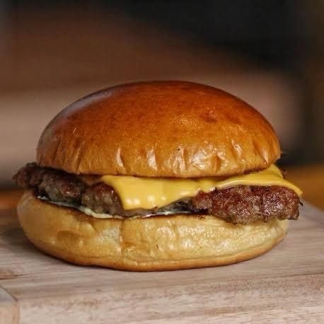 Pão brioche, maionese verde, barbecue, catupivegan, dois hambúrgueres goshen e cheddar!