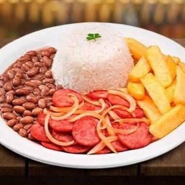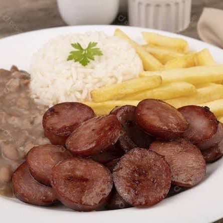 Arroz marmita de 250ml Feijão marmita 150ml Linguiça caprese + fritas marmita de 350ml Todas as marmitas são resistentes ao freezer e microondas