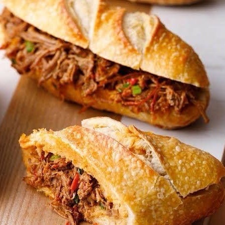 Baguete francesa assada na hora, costela vegana (carne de jaca desfiada temperada e levemente defumada), creme de alho, cebola e tomate picados