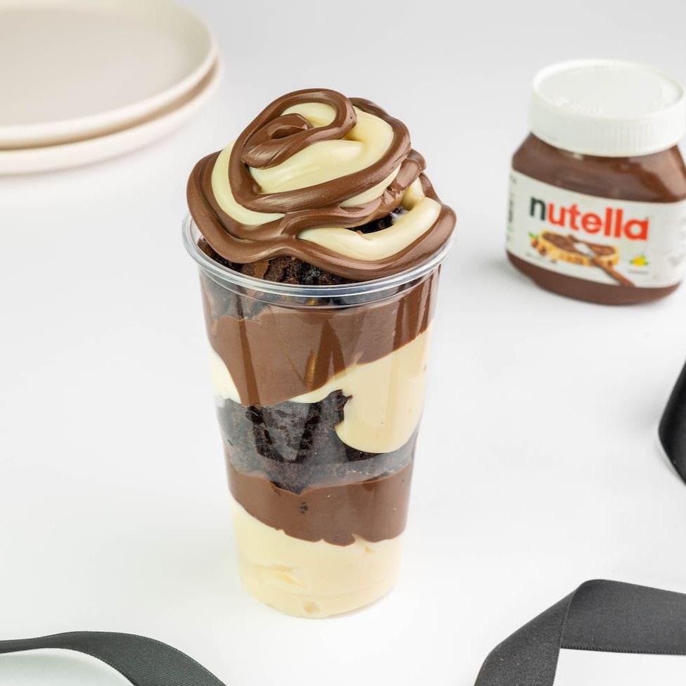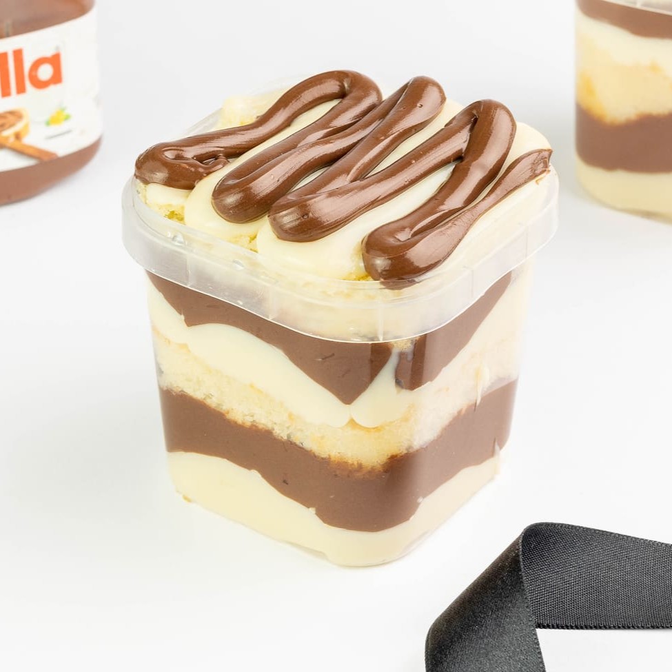 Bolo no pote com massa amanteigada e molhadinha, recheada com um delicioso creme de Ninho e Nutella (Original).