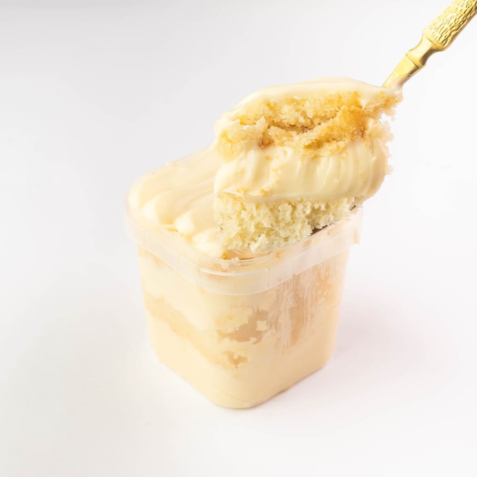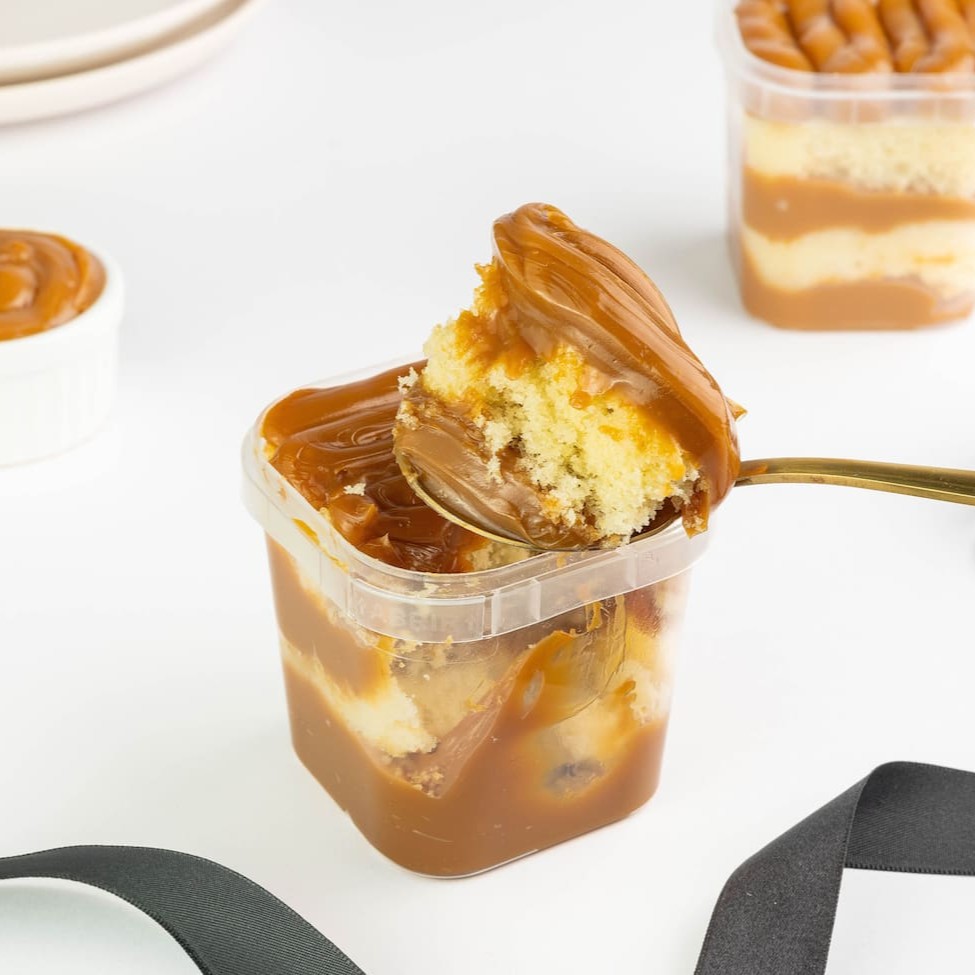 Bolo no pote com massa amanteigada e molhadinha, recheada com o melhor doce de leite da fazenda, super cremoso e saboroso, doce na medida certa!