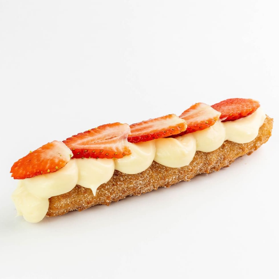 Churros super crocantes por fora e macios por dentro, com recheio de Nutella (Original) e pedaços de morango. Os churros são recheados por dentro e por cima, finalizados com um toque especial de açúcar com canela.