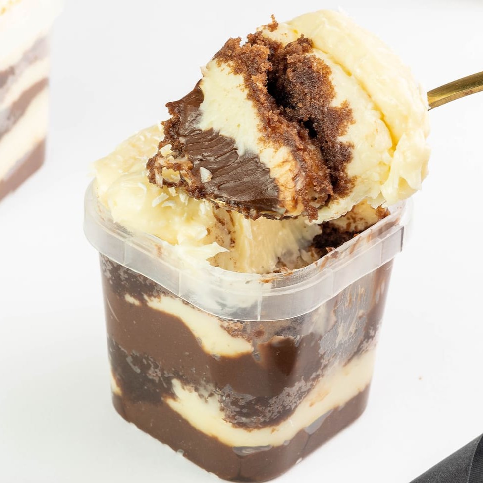 Bolo no pote com massa amanteigada e molhadinha, recheada com um delicioso brigadeiro de Ninho e chocolate belga.