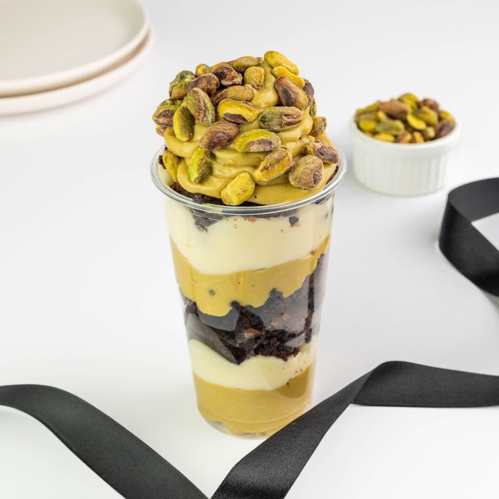 Pedaços de brownies super chocolatudos, recheados com creme de pistache e finalizados com grãos de pistache.