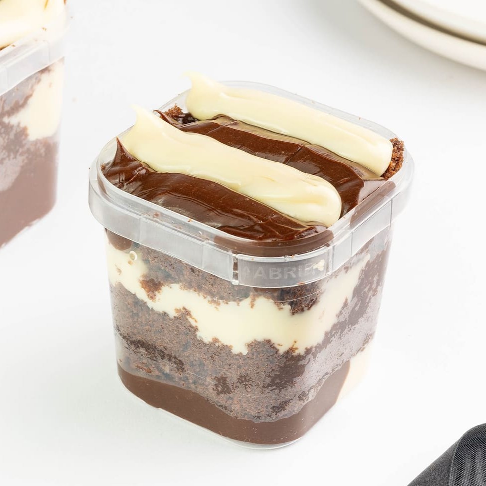 Bolo no pote com massa de chocolate amanteigada e molhadinha, recheada com um delicioso brigadeiro de chocolate belga.