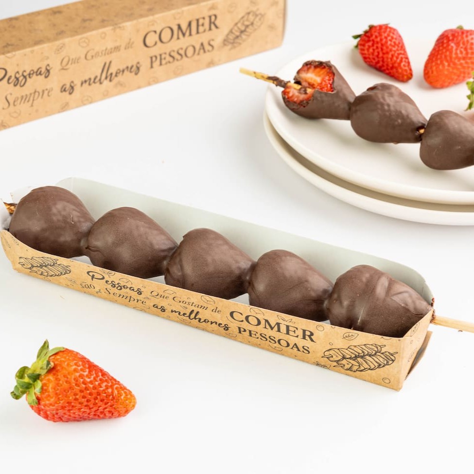 Espeto contendo 5 morangos selecionados banhados no chocolate belga. Enviados em uma linda embalagem (ótimo para presente).