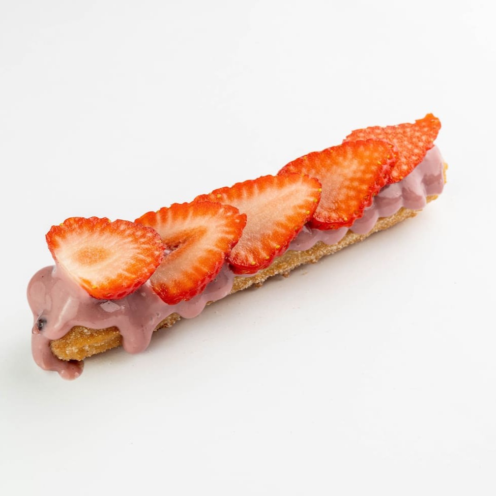 Churros super crocantes por fora e macios por dentro, recheado com um delicioso brigadeiro de Ninho e finalizado com pedaços de morango. Os churros são recheados por dentro e por cima, finalizados com um toque especial de açúcar com canela.