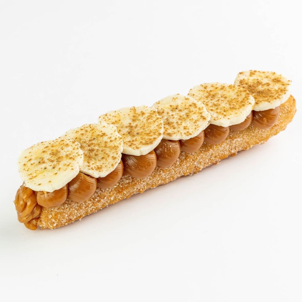 Churros super crocantes por fora e macios por dentro, com um irresistível recheio de Doce de Leite da Fazenda, banana prata em rodelas e um toque especial de canela em pó. Os churros são recheados por dentro e por cima, finalizados com um toque especial de açúcar com canela.