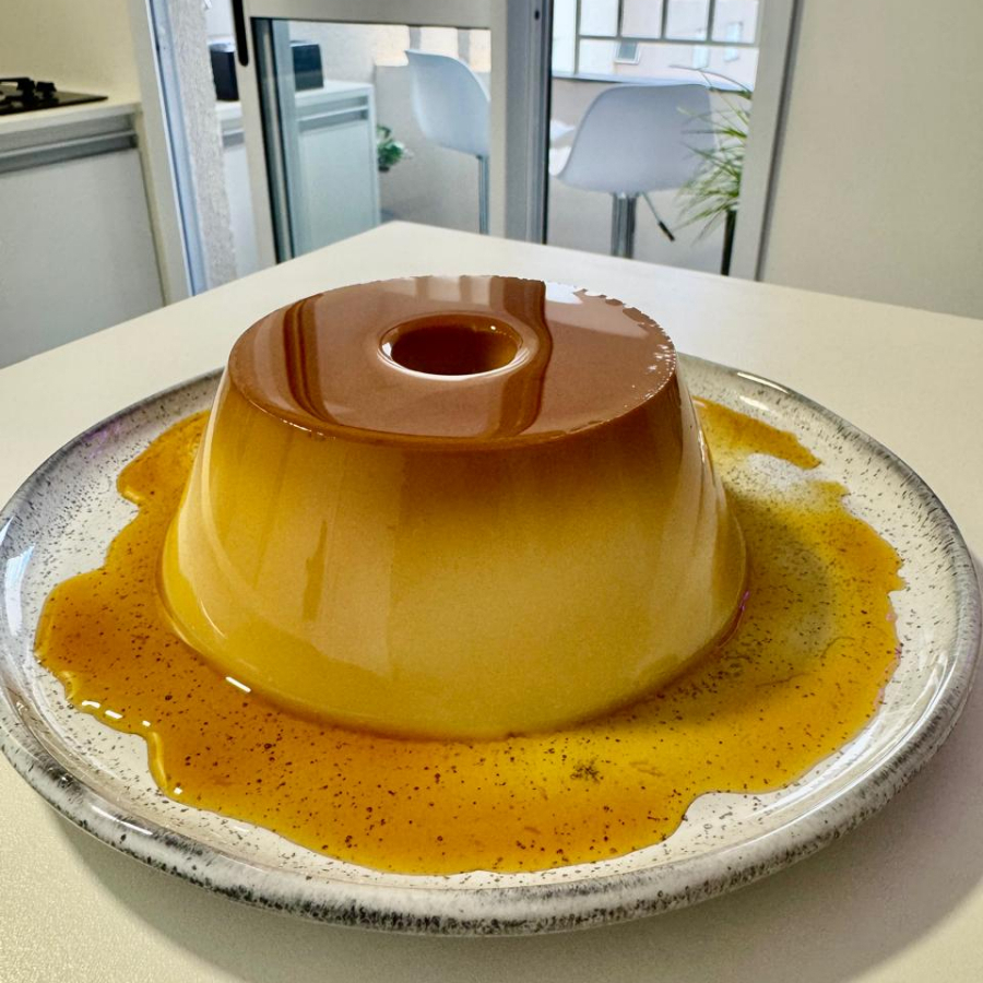 Pudim artesanal, assado em banho-maria, sem adição de farinha, gelatina ou conservantes.