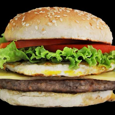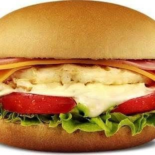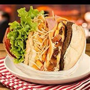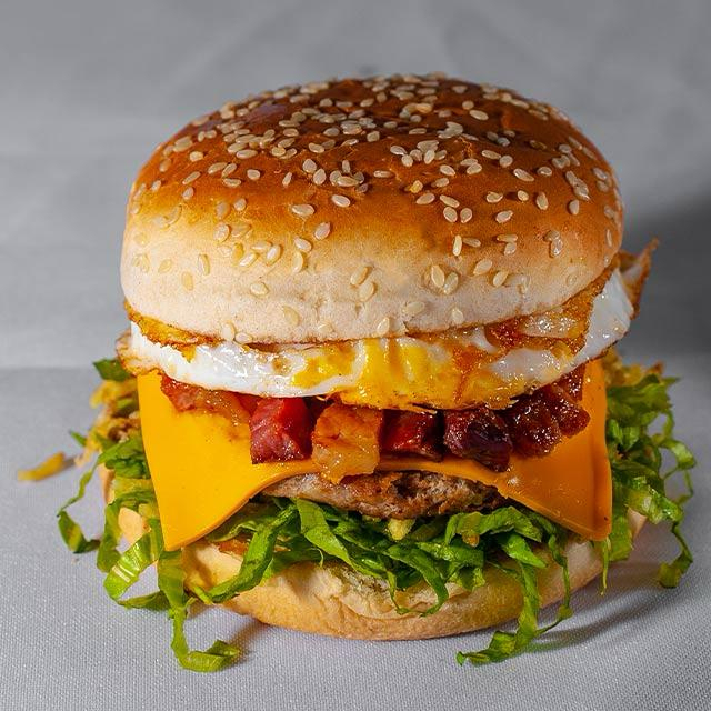Acompanhamento, hamburguer tradicional de 90GR, ovo,presunto, queijo, alface, tomate, cheddar, catupiry, maionese verde.