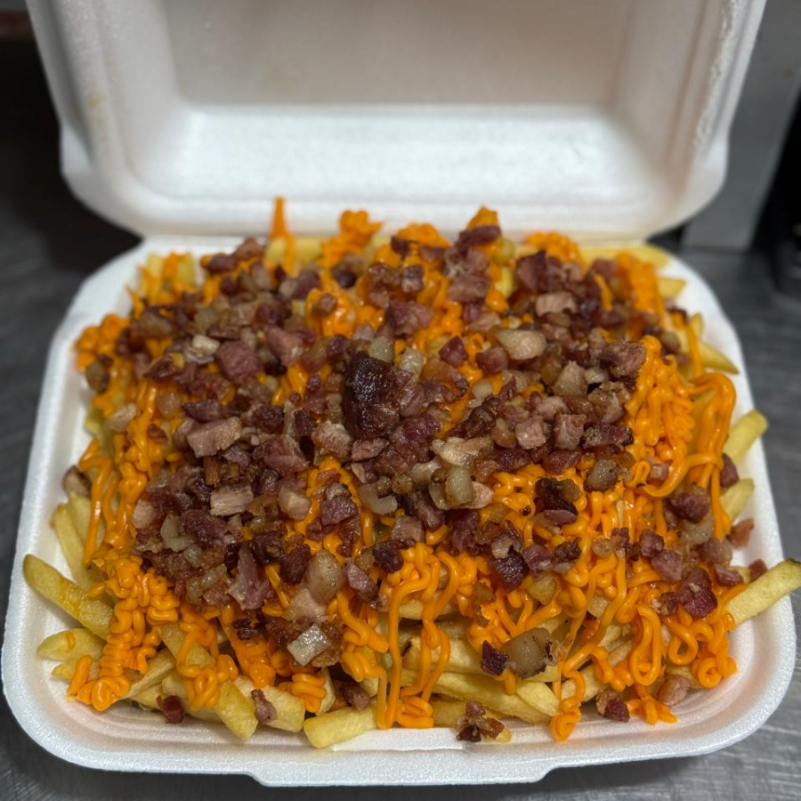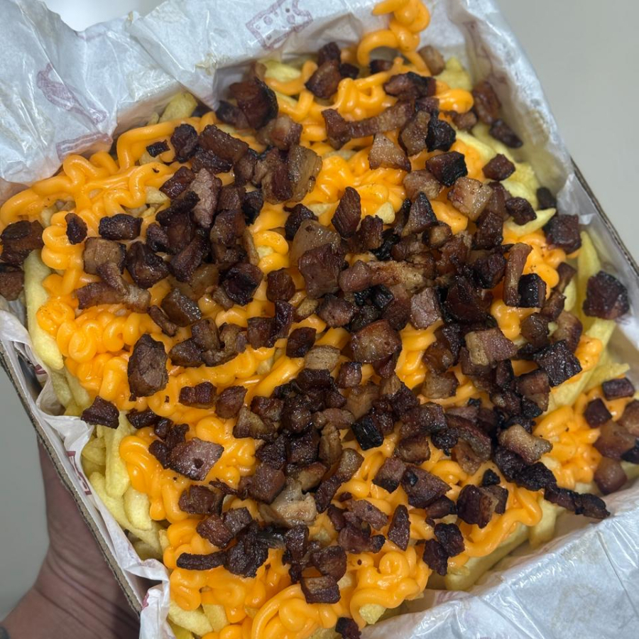 porção de batata frita, cheddar e bacon