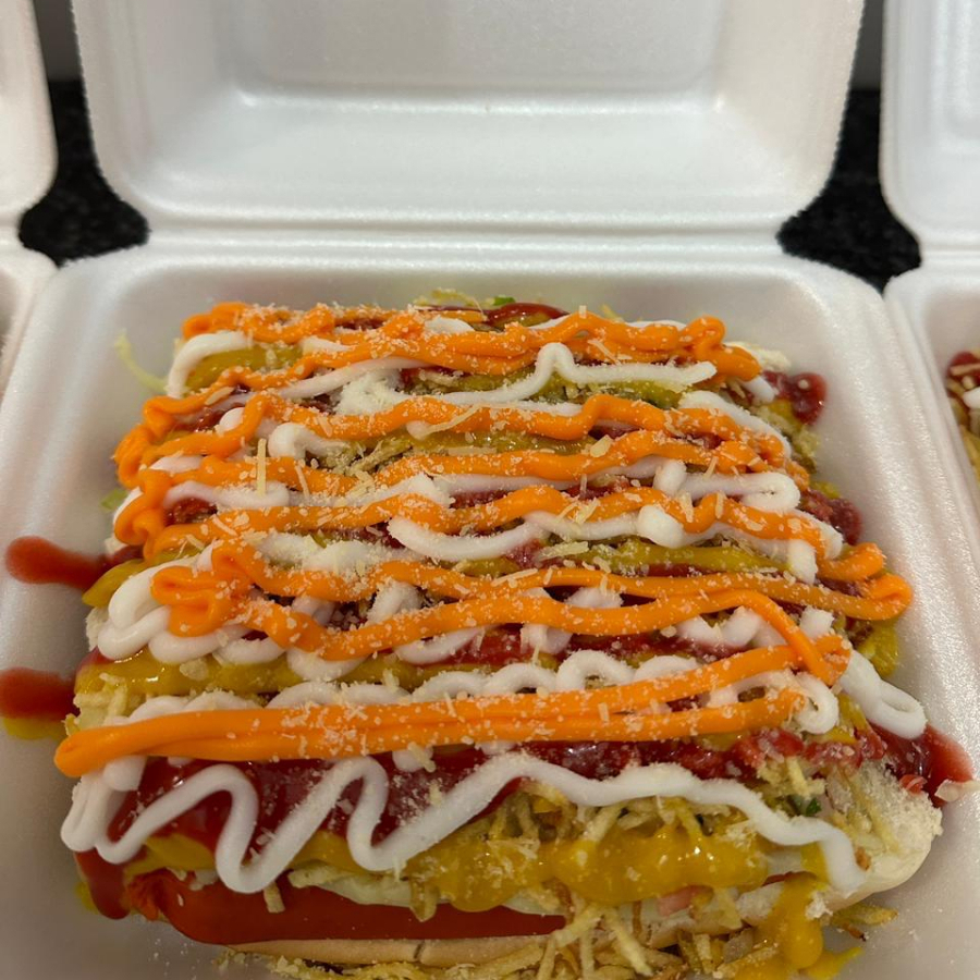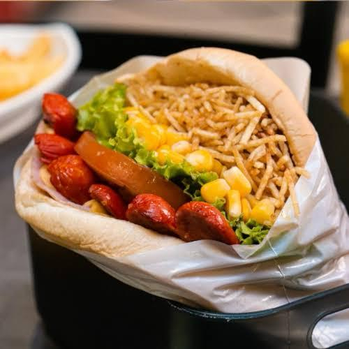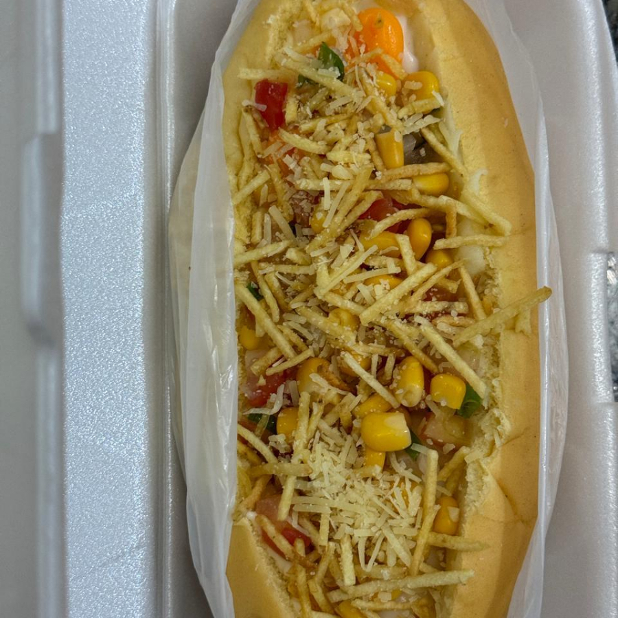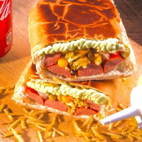 Acompanhamento, 2 salsichas, Bacon em cubos, purê de batata, vinagrete de tomate, cebola e coentro, milho verde, batata palha, cheddar, catupiry e maionese verde.