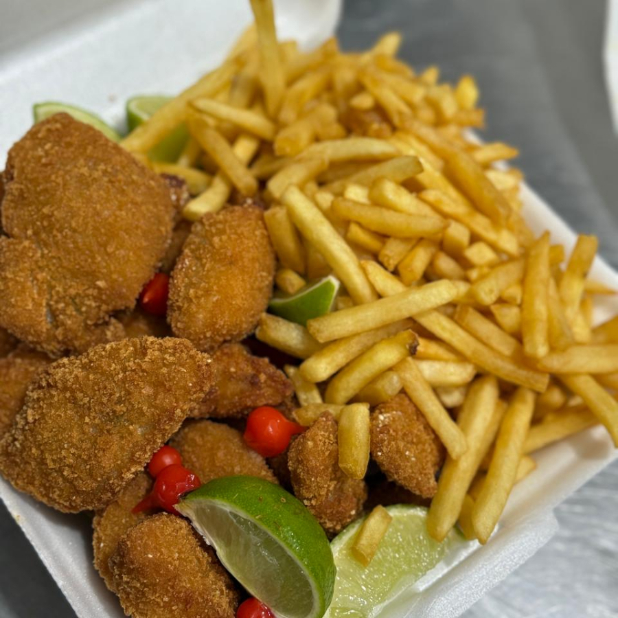 Acompanhamento, 1 porção de isca de tilapia,batata frita, pimenta biquinho, limao fatiado, e maionese verde