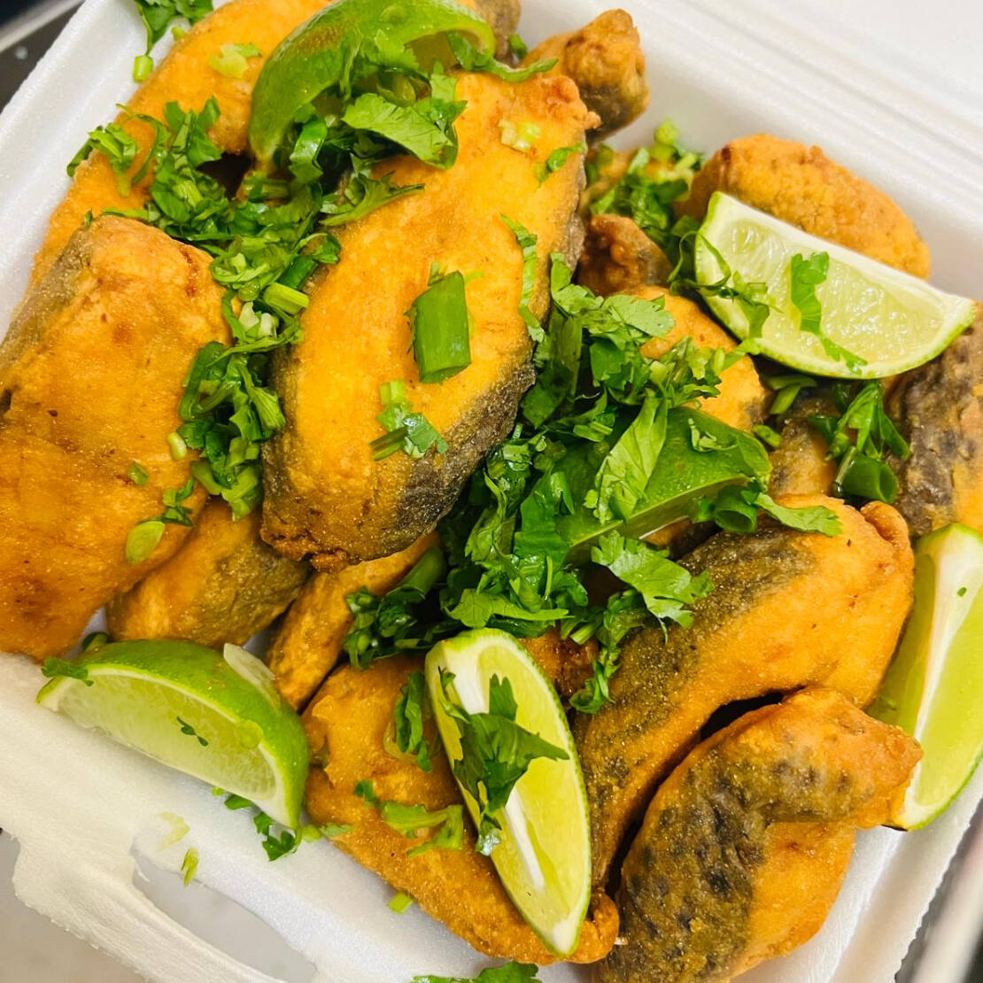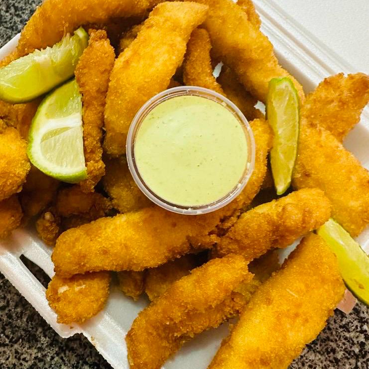 Acompanhamento, 1 porção de isca de tilapia, limao fatiado, e maionese verde