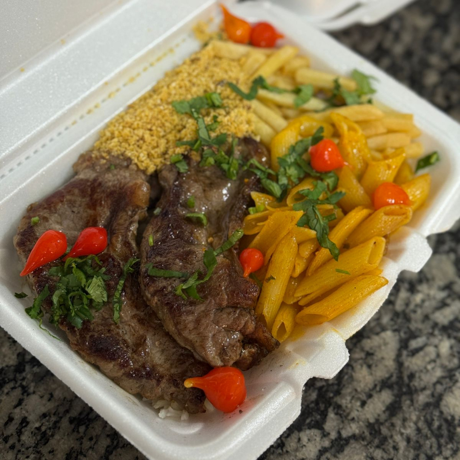 Acompanhamento: arroz, feijão, macarrão, contra file grelhad, batata frita, farofa temperada, pimenta biquinho, salada de alface tomate e cebola.
