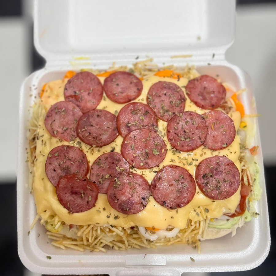 Acompanhamento, hamburguer tradicional de 90GR, ovo, Bacon fatiado, calabresa, presunto, queijo, milho verde, batata palha, alface, tomate, cheddar, catupiry, maionese verde.