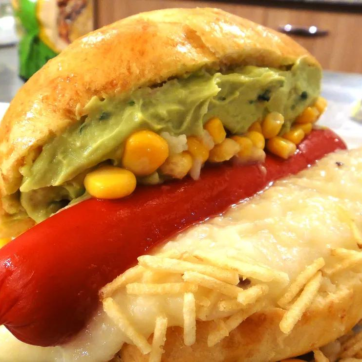 Acompanhamento, 2 salsichas, bacon, purê de batata, vinagrete de tomate, cebola e coentro, milho verde, batata palha, cheddar, catupiry e maionese verde.