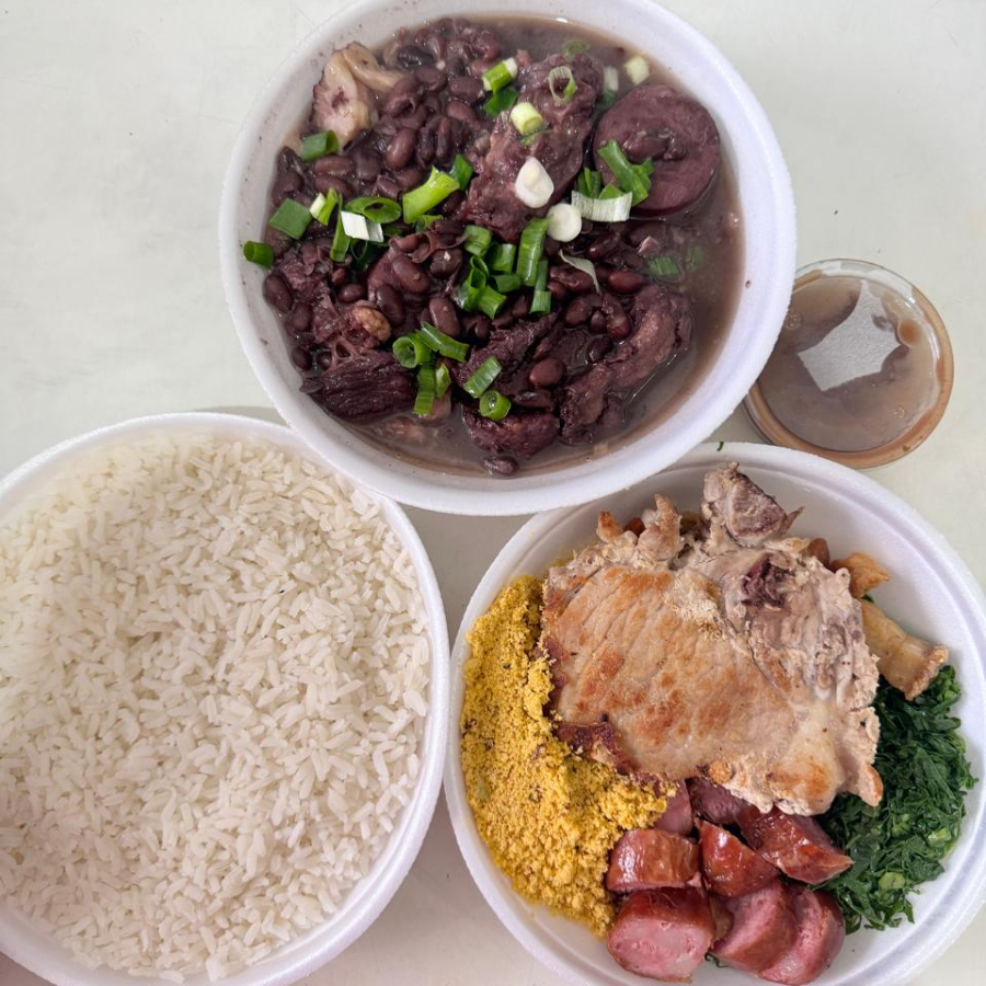 Acompanhamento: arroz, feijoada, couve refogado na manteiga e no alho, torremos, bisteca, linguça toscana, farofa temperada e molho de pimenta.