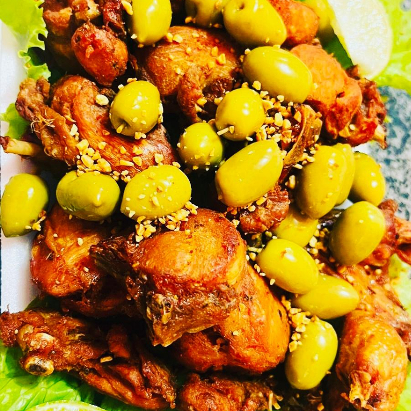 Acompanhamento, 1 porção de frango a passarinho, azeitona verde, alho frito, pão fatiado e torrado na manteiga e maionse verde